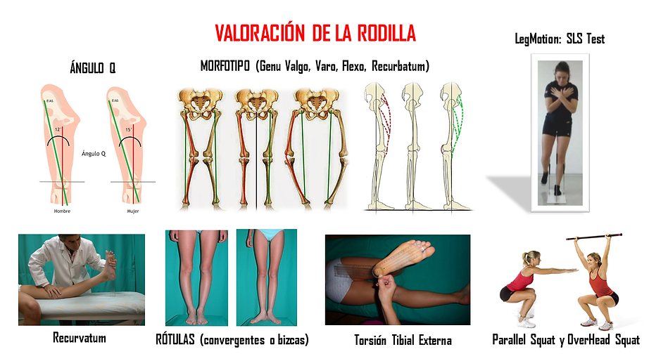 2.- Debemos identificar y cuantificar el morfotipo de las rodillas mediante el ángulo Q (genu varo o valgo), la disposición de las rótulas (bizcas o convergentes) y la existencia o no de genu flexo o recurvatum ya que nos indicará qué musculatura estará sometida a una mayor tensión y, por ende, a un mayor riesgo lesional.